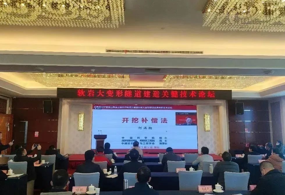 2023年1月5日下午,伴随着隧道的全幅贯通仪式,顺利召开了软岩大变形隧道建造关键技术论坛,何满潮院士受邀作题为开挖补偿法的专题报告,讲解了平行于普氏法和新奥法的开挖补偿法,阐明了相关力学原理。详细介绍了NPR新材料的超常力学特性。以新理论、新材料和新技术为解决滇藏地区重大工程建设奠定基础。